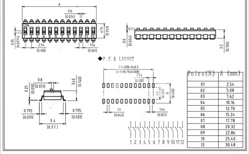 2.54mm Pith SMD Switch Black 2P/3/4/5/6/8/10P Dip switch